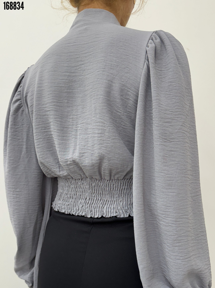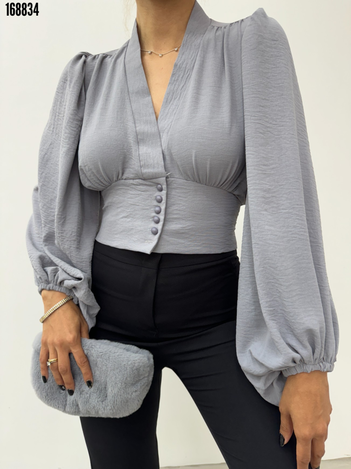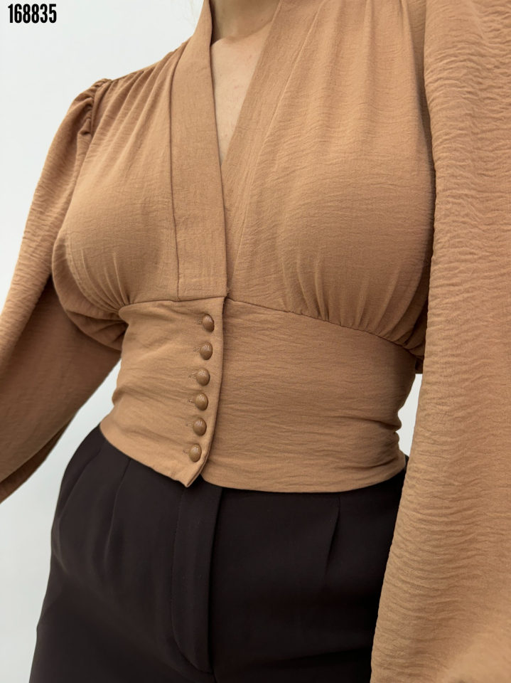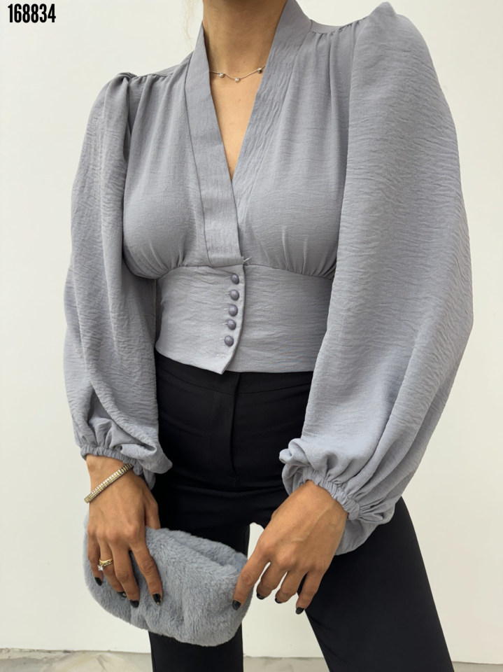 - Düğmeli Arkası Lastikli Balon Kol Sandy Crop Vizon