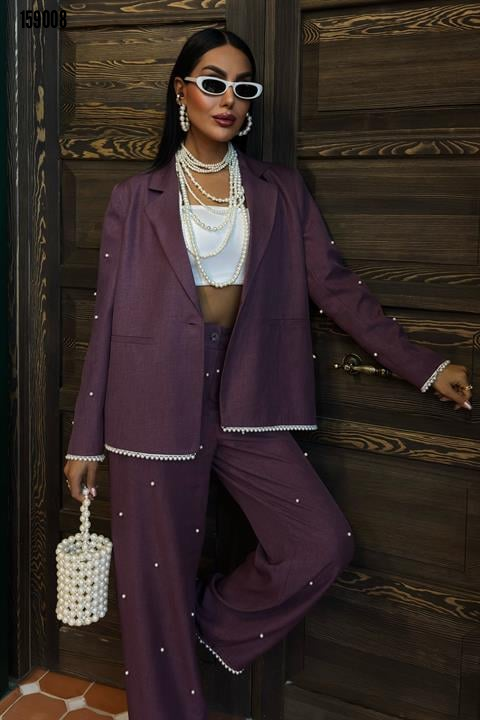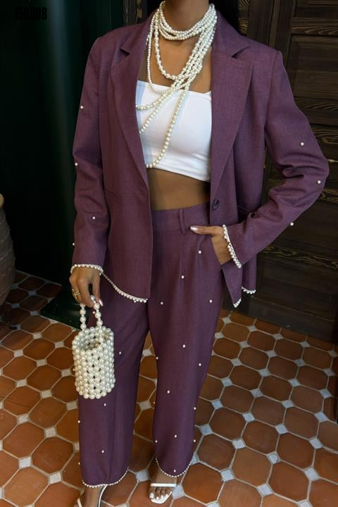 - İnci Detaylı Ceket Pantolon Keten Takım 10124