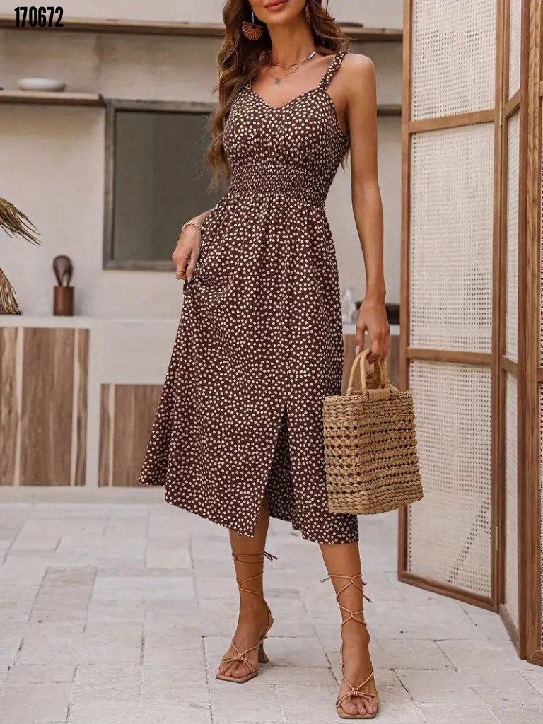 - Kadın askılı v yakalı beli lastikli yırtmaçlı süprem midi elbise