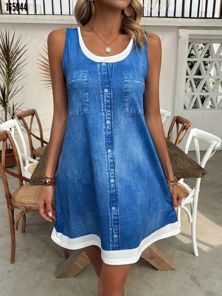 - Kadın askılı yuvarlak yakalı kot görünümlü kısa süprem elbise