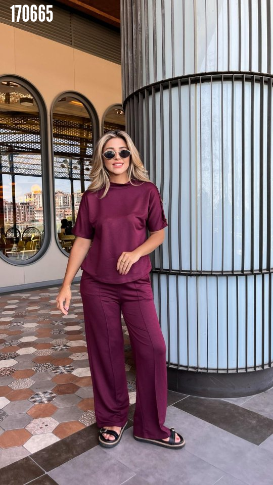 - Kadın kısa kollu bisiklet yaka omuzdan düğmeli viskon iki iplik kısa bluz ve pantolon ikili takım