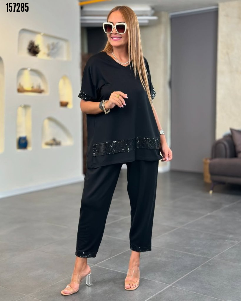 - Kadın kısa kollu v yakalı pul payetli viskon iki iplik bluz ve pantolon ikili takım