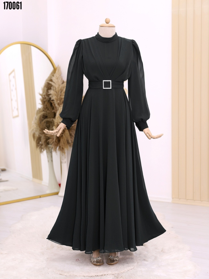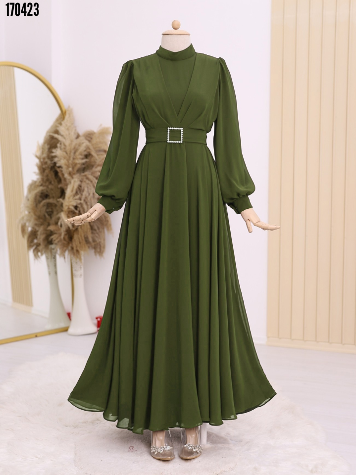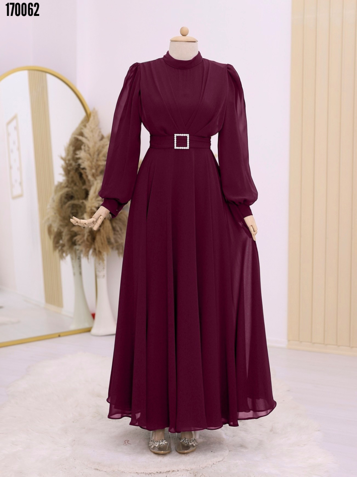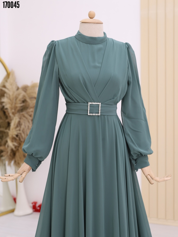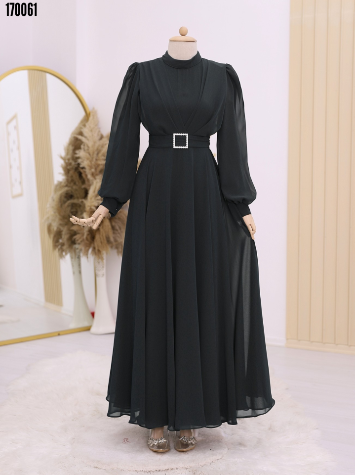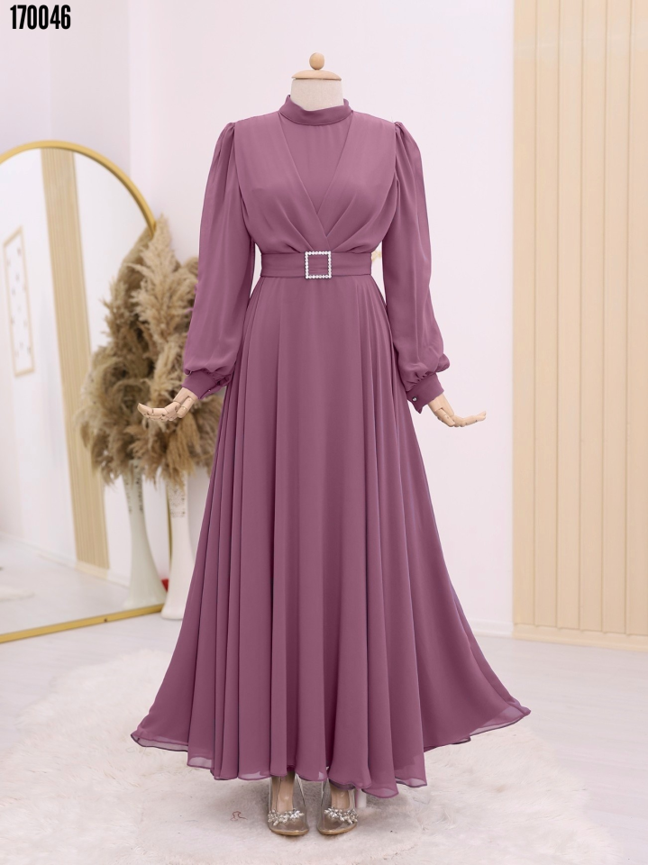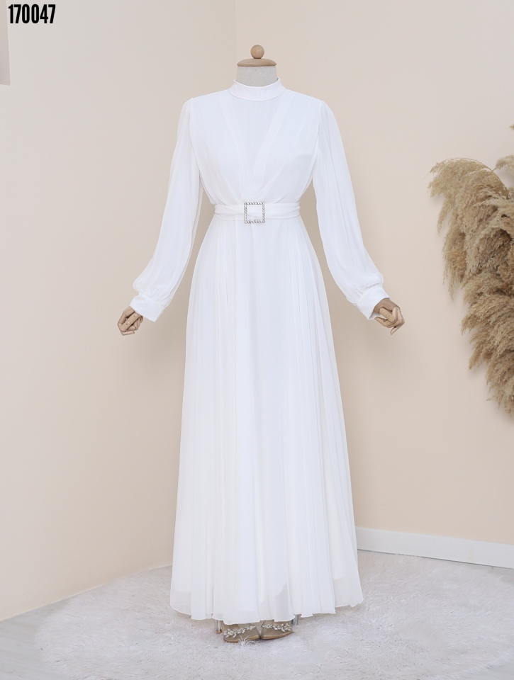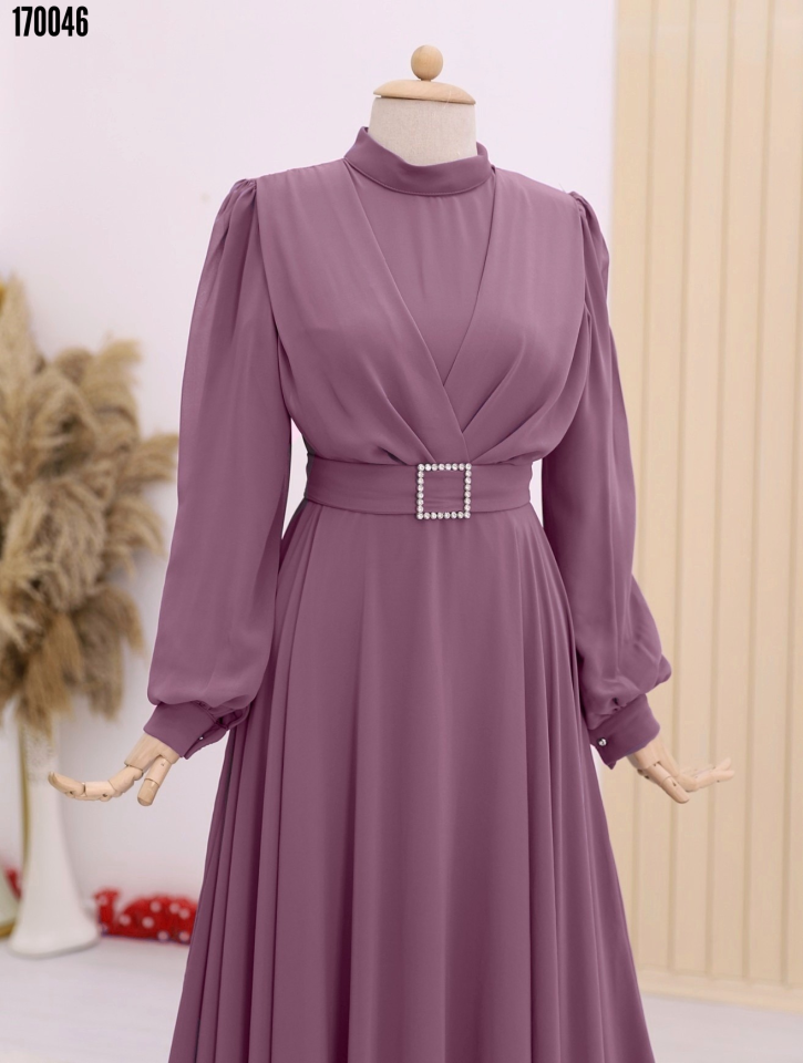 - Kemeri Taşlı Önü Pileli Tesettür Elbise