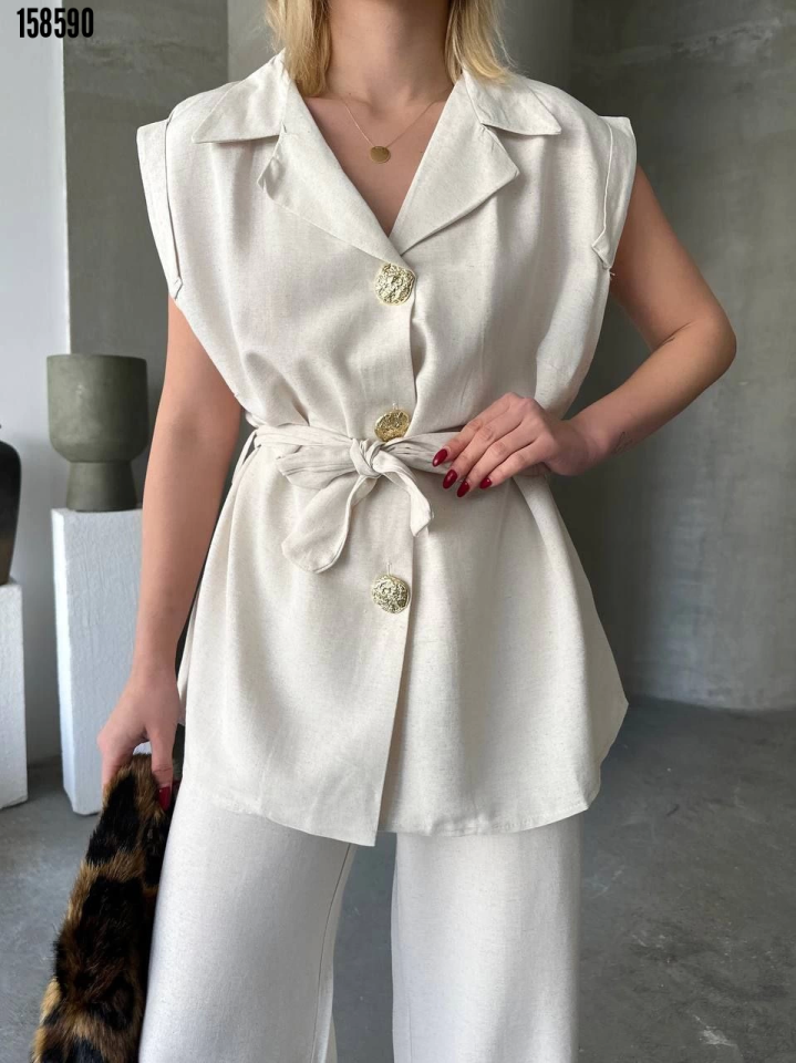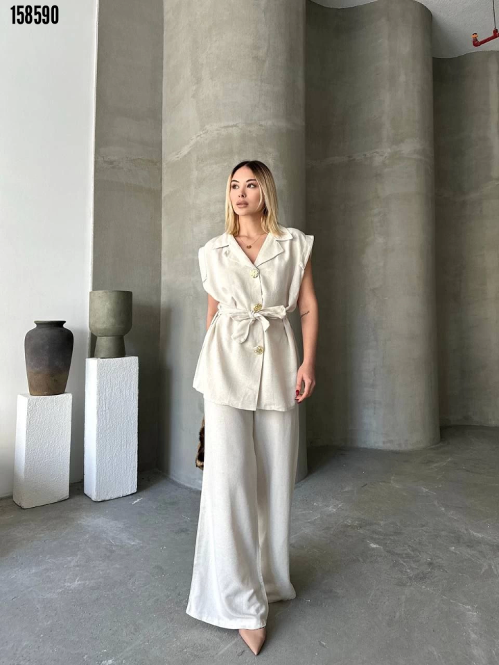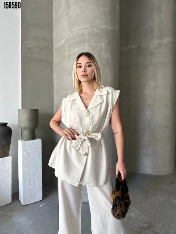 - Keten Sıfır Kol Kuşaklı Ceket Pantolon ikili Takım Beyaz
