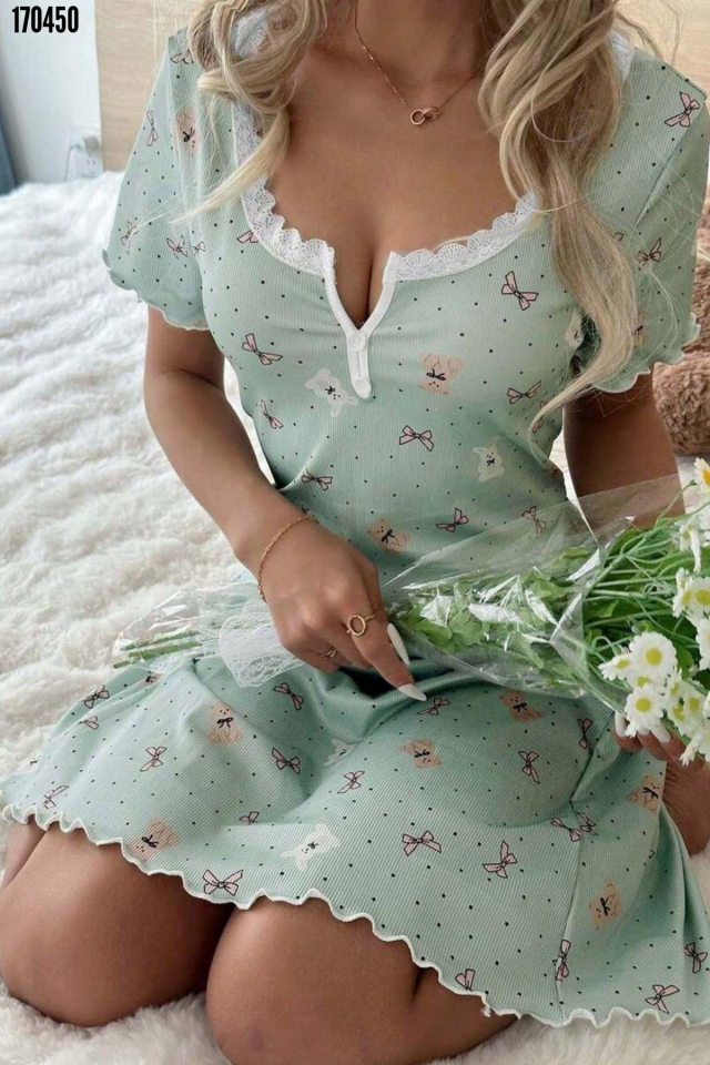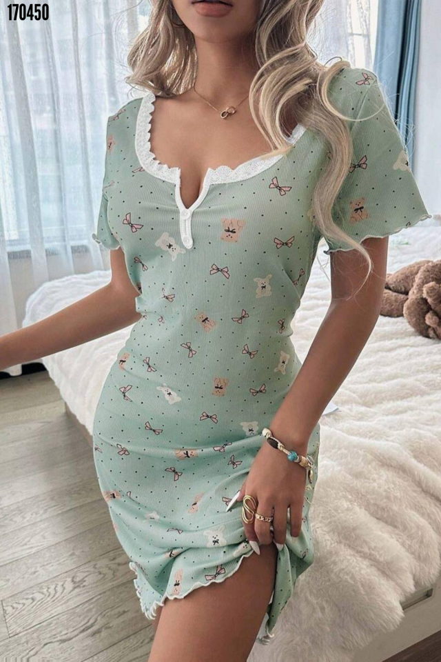 - Yeşil Ayıcık ve Fiyonk Desenli Mini Ev Giyim Gecelik 15997